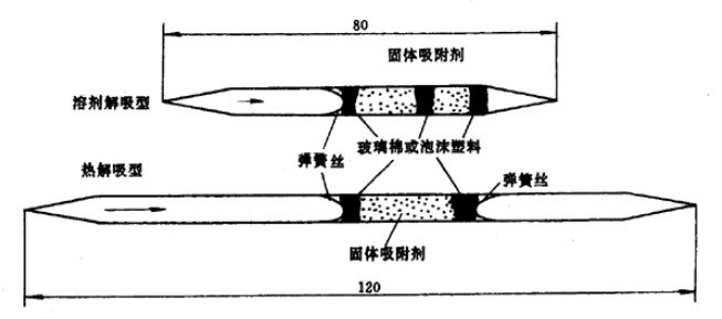 溶剂解吸型硅胶管:管长80mm。内径3.5~4.0mm,外径5.5~6.0mm;前段装200mg硅胶,后段装100mg活性炭。